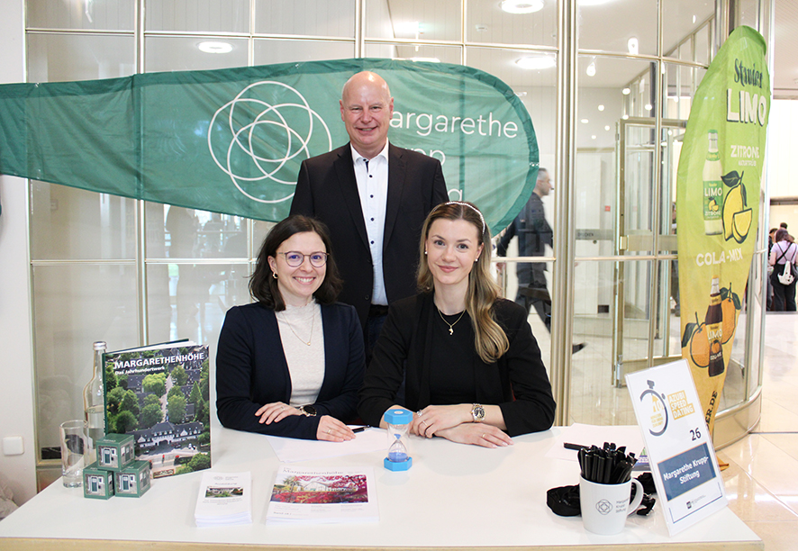 Schon mehrfach war die Margarethe Krupp-Stiftung beim von der IHK organisierten Azubi-Speedating in der Essener Philharmonie dabei. Ein „Perfect Match“ gab es bisher nicht, dafür aber zahlreiche Schülerinnen und Schüler, die Interesse am Unternehmen und der Ausbildung zur Immobilienkauffrau, bzw. zum Immobilienkaufmann bekunden. Insgesamt präsentieren sich über 100 Unternehmen den ausbildungsplatzsuchenden Schülerinnen und Schülern der weiterführenden Schulen. Welcher Arbeitgeber passt zu mir und welchen Azubi könnten wir uns vorstellen – darum dreht es sich beim schnellen Kennenlernen. Zehn Minuten stehen zur Verfügung, die Sanduhr steht auf dem Tisch.