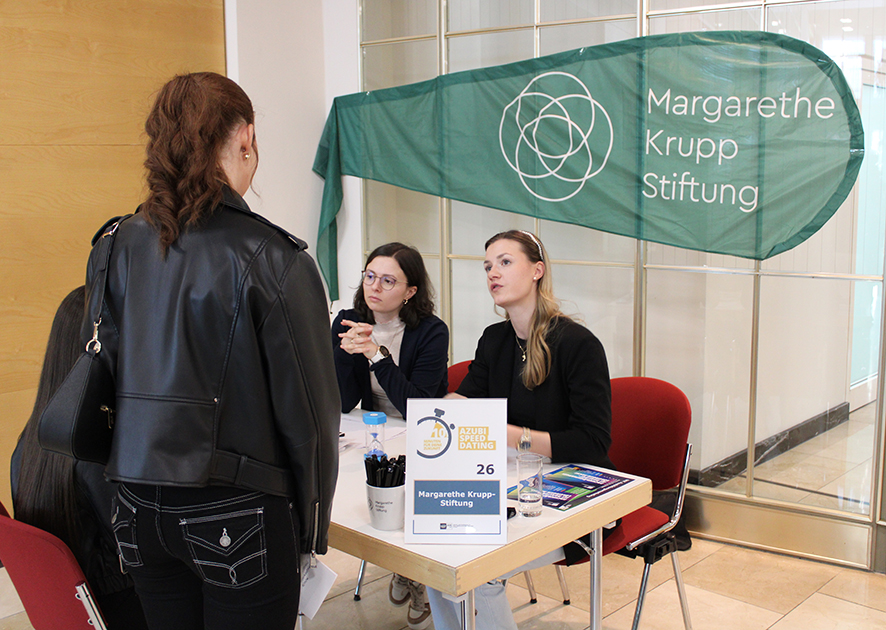 Linda Goris und Paulina Matthay führen beim Speeddating die Gespräche. Beide haben in der Vergangenheit selbst ihre Ausbildung bei der Margarethe Krupp-Stiftung absolviert und sind nach wie vor begeistert. „Wir möchten gerne vermitteln, wie vielseitig dieses Berufsbild ist“, betont Paulina Matthay und Linda Goris fügt hinzu: „Wir werben gerne für unseren Beruf!“