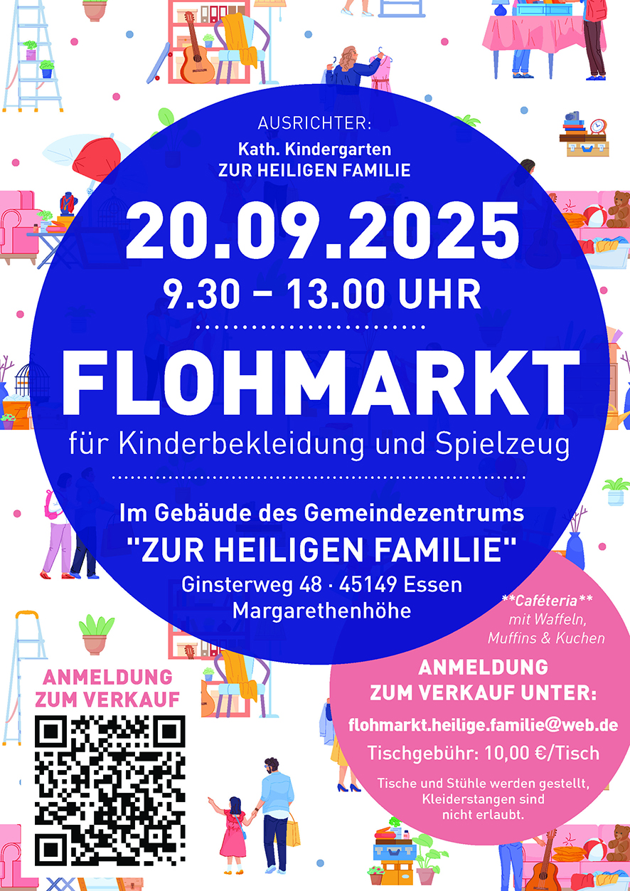 Der Katholische Kindergarten zur Heiligen Familie lädt am 20. September von 9.30 Uhr bis 13 Uhr zu einem Flohmarkt für Kinderbekleidung und Spielzeug ins Gemeindezentrum am Ginsterweg 48 ein.