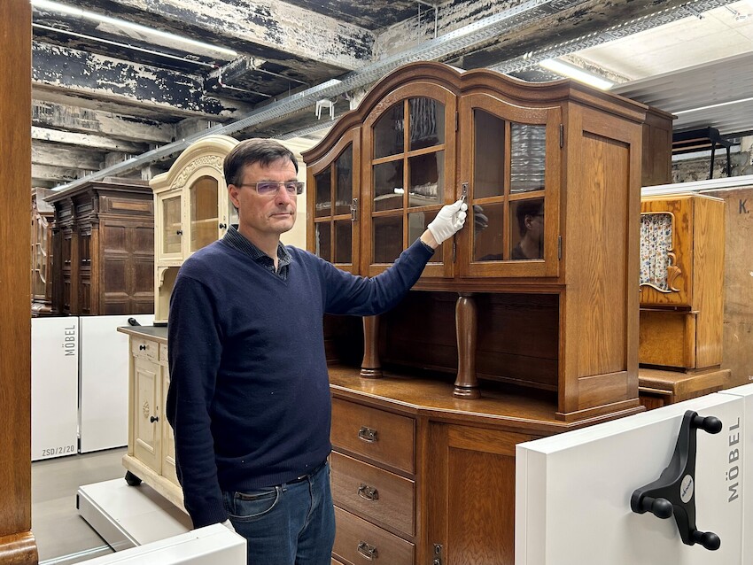 Auf den Fotos zeigt Dr. Axel Heimsoth die Metzendorf-Schränke im Schaudepot des Ruhr Museums. Fotos: Ruhr Museum/ Katharina Diekmann