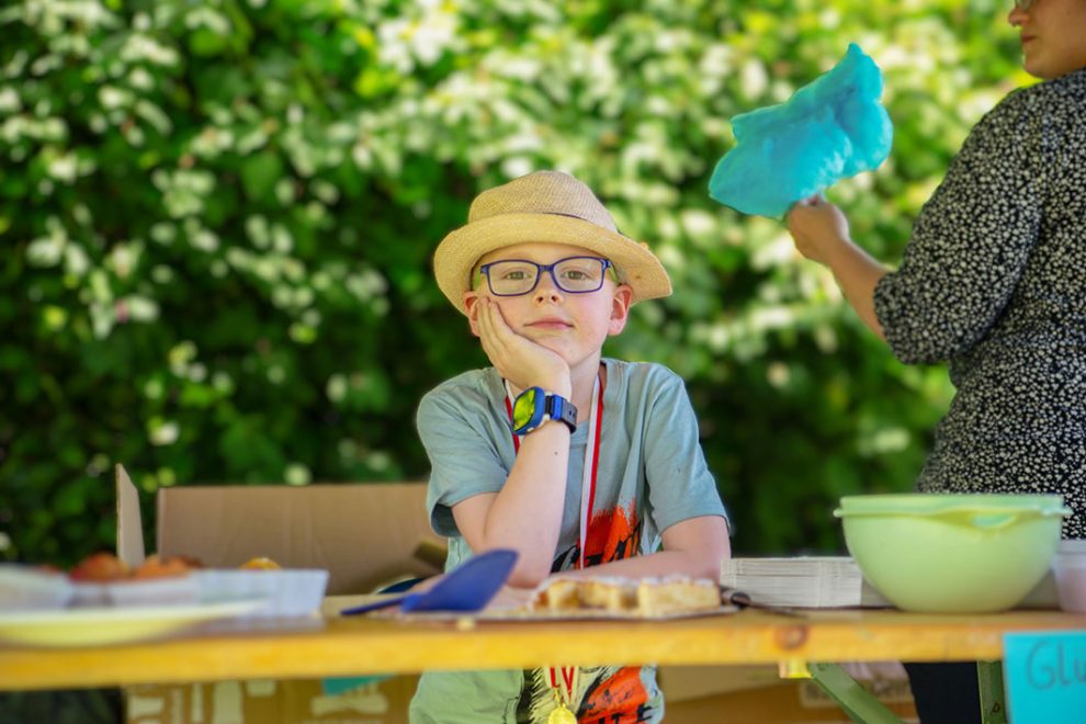 Bei bestem Wetter konnten die Kids und ihre Eltern ein Picknick im Schatten auf der Wiese mit Kuchen und bunten Muffins machen und die türkise Zuckerwatte als ganz besonderes Highlight genießen. Auch ein Clown war vor Ort und hatte schnell viele Fans.