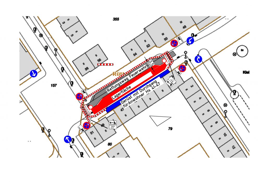 Für Fußgänger und Fahrradfahrer ist der Bereich weiterhin passierbar. Der gegenüberliegende Gehweg bleibt frei und das Gerüst erhält einen Fußgängerdurchgang. Für Autofahrer sind die notwendigen Umleitungen ausgeschildert.